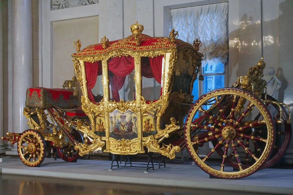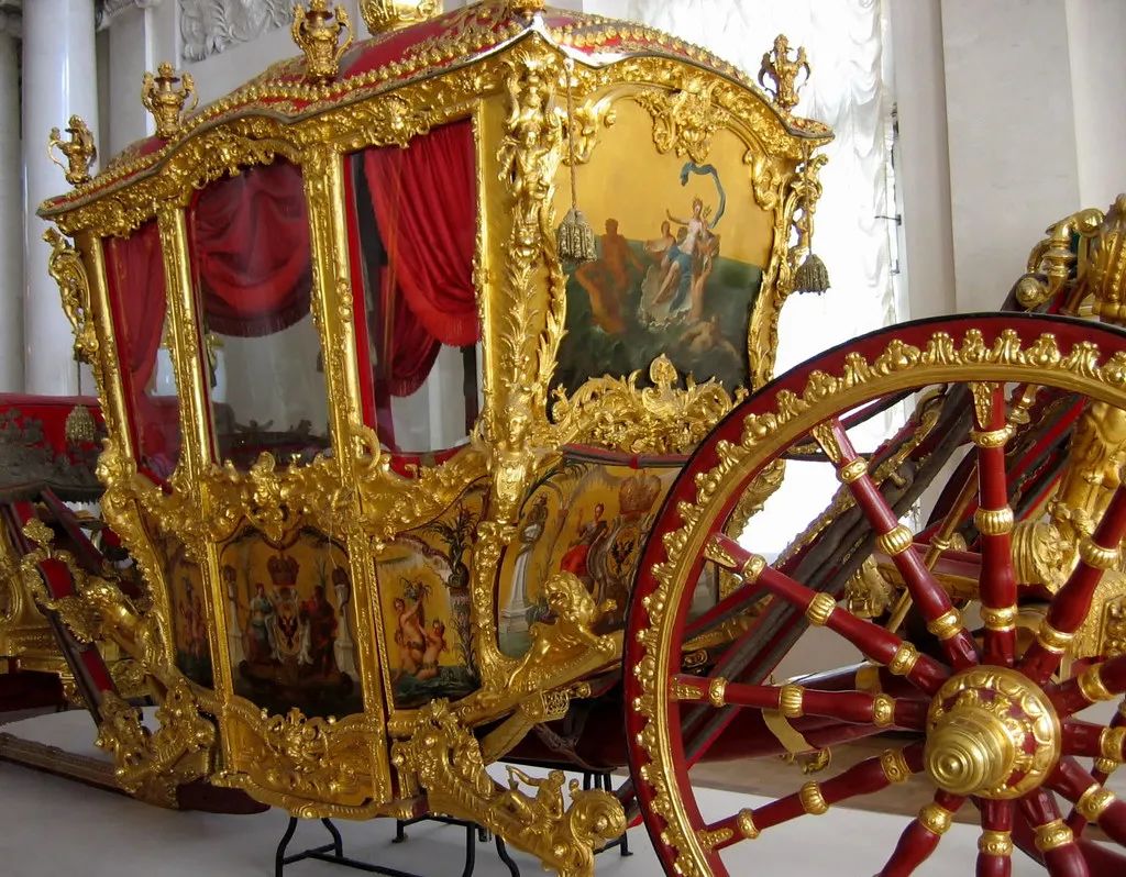 在各国王室的帝后御用马车中,曾属于俄罗斯帝国的两架加冕马车同样以绝代风姿令人印象深刻。其中,较大的那架由彼得一世为他的妻子打造,且还特意委托了法国著名宫廷画家弗朗索瓦·布歇亲自来绘制装饰画。后来,凯瑟琳大帝对此进行了翻新,大放异彩的它从此便成为了俄罗斯君主专属加冕马车。