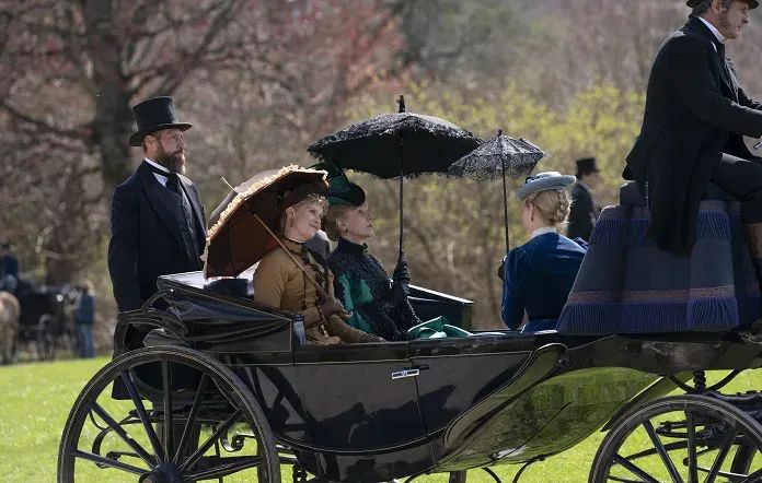 在《镀金时代》中,便常常会出现这样一幕——三五成群的小姐太太们人手一把小阳伞,一边惬意地坐在一辆大型马车上,一边兜风一边谈论新闻八卦。
