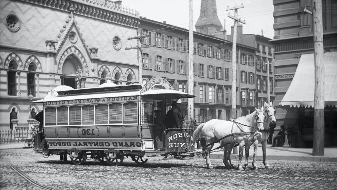 据说,当时看人的第一步就是打量对方的裤脚,上半身穿得再光鲜亮丽,只要裤腿不干净就意味着在告诉别人自己是一个连马车都坐不起的穷光蛋。Omnibus中还有一类上下分层的双层马车,这类车的载客量更大,但也更慢——因为拉车的马儿仍旧维持在两匹。这也造成了在纽约这样的大都市中,每年都会累死成千上万匹马儿的悲惨局面。