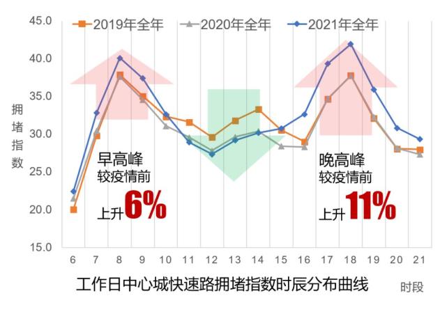 市交通委介绍,近日,上海市城乡建设和交通发展研究院发布了《2021年度上海市综合交通运行年报》,报告显示,2021年全市工作日出行总量约5400万人次/日,同比增长18%;中心城快速路工作日早晚高峰拥堵指数较2019年分别上升6%、11%;2021年城市客运(轨道、公交、轮渡、出租)日均客运量1658万乘次/日,同比增长21%;截至2021年,累计创建753个停车资源共享利用项目,提供3.49万个共享泊位。详见↓