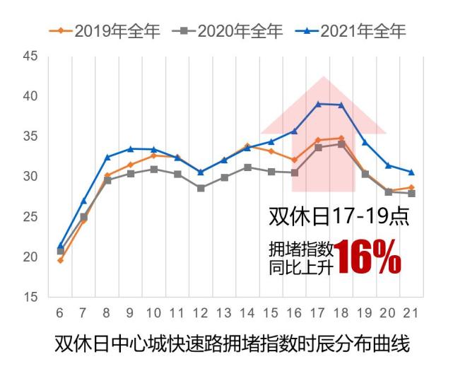 中心城快速路工作日早晚高峰拥堵水平已超疫情前,拥堵指数较2019年分别上升6%、11%,平峰受限行政策调节有所改善,晚高峰道路运行压力明显增加,晚高峰拥堵指数已超过早高峰5%;