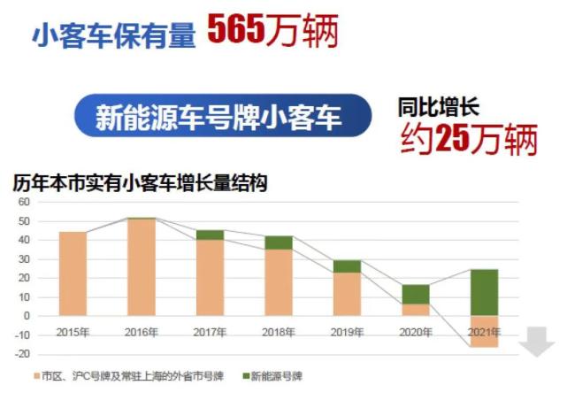 一是道路交通电动化加速转型,存量置换特征更加明显。2021年本市小客车实有量增速持续放缓,达到565万辆。其中,新能源号牌小客车快速增长,同比增加约25万辆,累计达到54万辆。燃油车呈现明显的负增长,除非营业性客车额度拍卖号牌车辆增长外,沪C号牌同比减少约12万辆,根据保险同业公会统计,在本市购买保险的外牌车辆同比减少约15万辆。运营车辆的新能源化转型更加快速,至2021年底累计推广纯电动出租车约1.6万辆,累计投放新能源地面公交车约1.4万辆;新能源车使用更加便利,全市累计建成各类充电桩超过50万根,其中公共、专用桩约13万根,建成换电站68座,全市车桩比1.36:1,处于国内领先水平。二是运输结构调整取得新突破,集装箱水水中转比例为49.6%,海铁联运箱量约41.7万标准箱,同比增长55.6%。中欧班列上海号首发,为外贸运输提供了更多的选择。
