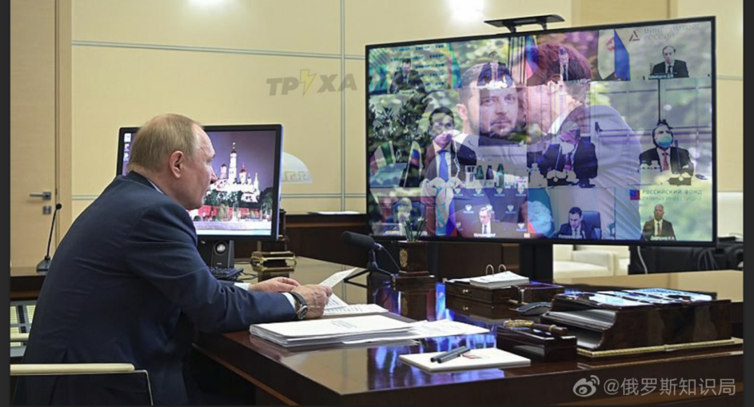 - 微博用户发布的这张“普京在屏幕前看马克龙拥抱泽连斯基”的图片进行过后期处理,原图来自于俄罗斯卫星通讯社,展现的是今年1月普京在莫斯科与意大利商人视频连线一事。