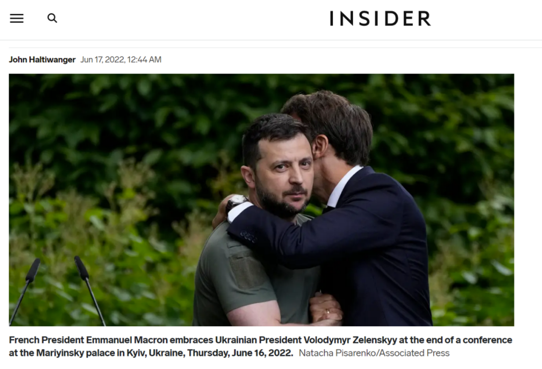 6月初,据Ladepeche、France24等多家法国媒体报道,马克龙在6月3日接受法国本地媒体采访时发表意见:“我们决不能羞辱俄罗斯……这样,当战斗停止的那一天,我们就可以通过外交手段建立一个出口坡道。”此言一出,舆论哗然,《基辅独立报》和CNN写道,泽连斯基在6月7日接受《金融时报》的广播采访时公开批评了马克龙的这一表态,表示“我们不打算羞辱任何人”“我们将以牙还牙”。