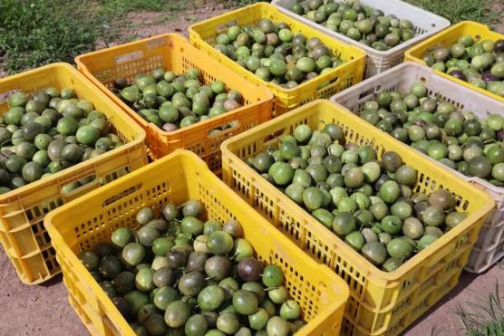 走进建水县新房村委会红河蓉盛坚果开发有限公司百香果种植基地,满眼是望不尽的绿色,往爬藤架下一钻,抬头四望,像小灯笼一样的百香果成串悬挂,水灵惹人喜爱,从枝头摘下后隔着果皮都能闻到淡淡的香味,让人垂涎欲滴。百香果从6月挂果,可一直采摘到次年4月,果期长达11个月,盛果期时基地每天需要100多人采摘、装车。