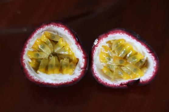 百香果中含有蛋白质、糖类和多种维生素及氨基酸,营养丰富,酸甜可口,风味浓郁,芳香怡人,享有“饮料味精”和“果汁之王”的美誉。成熟的果实表面逐渐从绿色转变成紫红色,果皮会出现发皱,凹陷,变干的现象,这正是百香果成熟的自然状态。果实表皮发皱变干,对内部的果肉没有任何影响,反而会让果瓤更加香甜。切开后馥郁果香扑面而来,橙黄的肉粒饱满到轻轻一碰就爆裂而出,挖一勺放入口中,果肉酸爽汁水充沛,细嚼芳香满口更是清醒整个味觉!