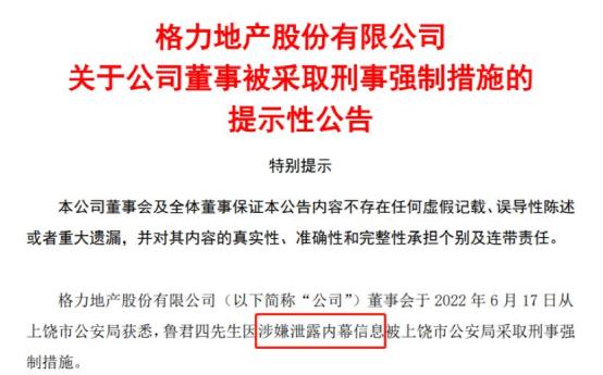 6月17日晚,格力地产公告,董事会于2022年6月17日从上饶市公安局获悉,公司董事鲁君四因涉嫌泄露内幕信息被上饶市公安局采取刑事强制措施。