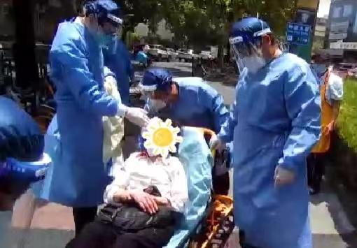 “您感到还有哪里受伤吗?” 担心老人身体的殷俊一边安慰她,询问伤情,一边帮助老人遮挡刺眼的阳光。