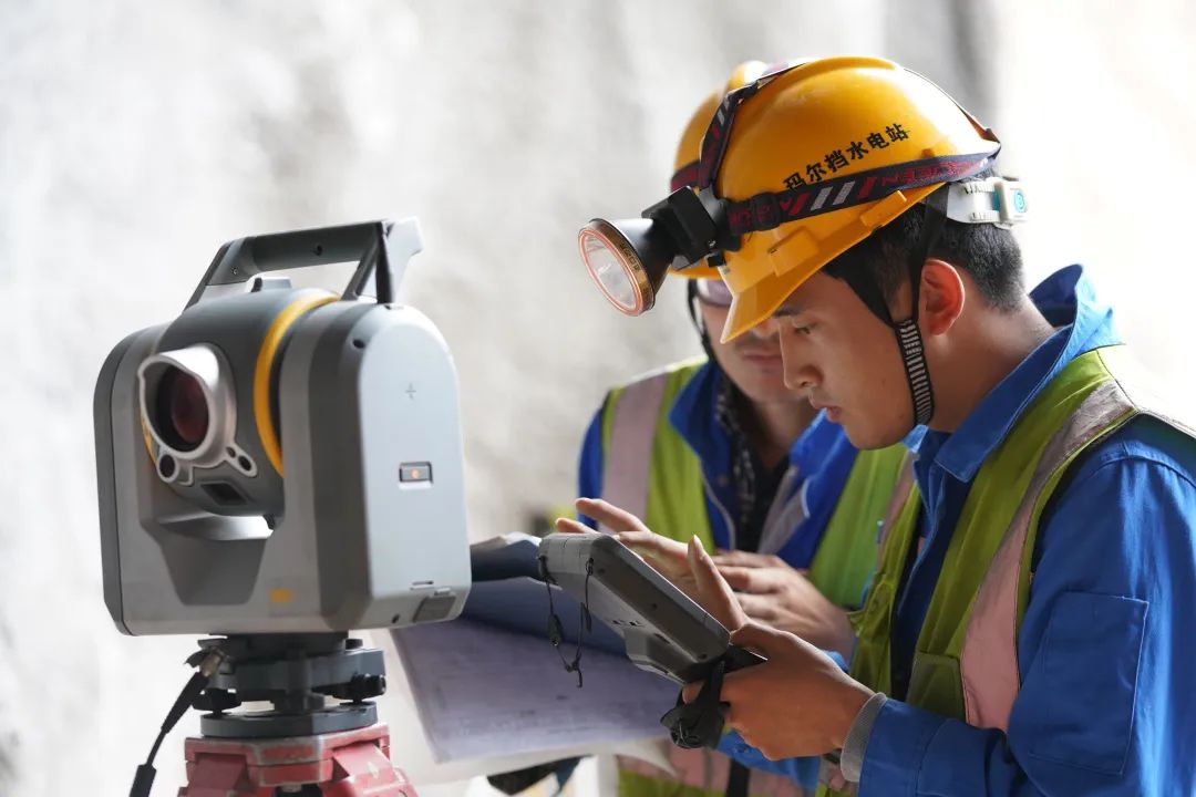 “向前3公分,向左1公分……”在玛尔挡项目3号引水竖井施工现场,测量队正在采用扫描仪、测量机器人等设备进行工作面放样。通过手机APP,能够直观地看到隧洞超欠挖等各种数据,仪器与手机同步显示测量结果。测量队队长章建银介绍,玛尔挡项目地处河谷,风力较大,在竖井放样中,传统的吊垂球测量法在大风环境下精度有限且耗时较长。为此,他们使用了激光垂准仪配合自制专用仪器架设平台开展工作,大大节省了时间和人力。