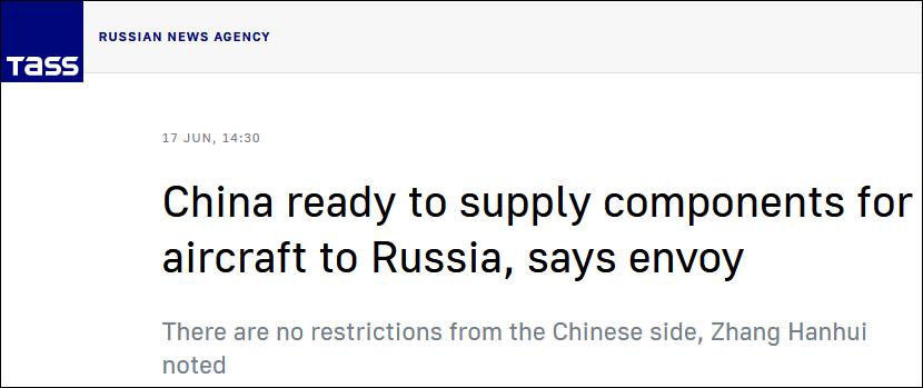 据俄罗斯塔斯社当地时间6月17日报道,中国驻俄罗斯大使张汉晖当天告诉该媒体,中国准备向俄罗斯航空公司提供飞机零部件。