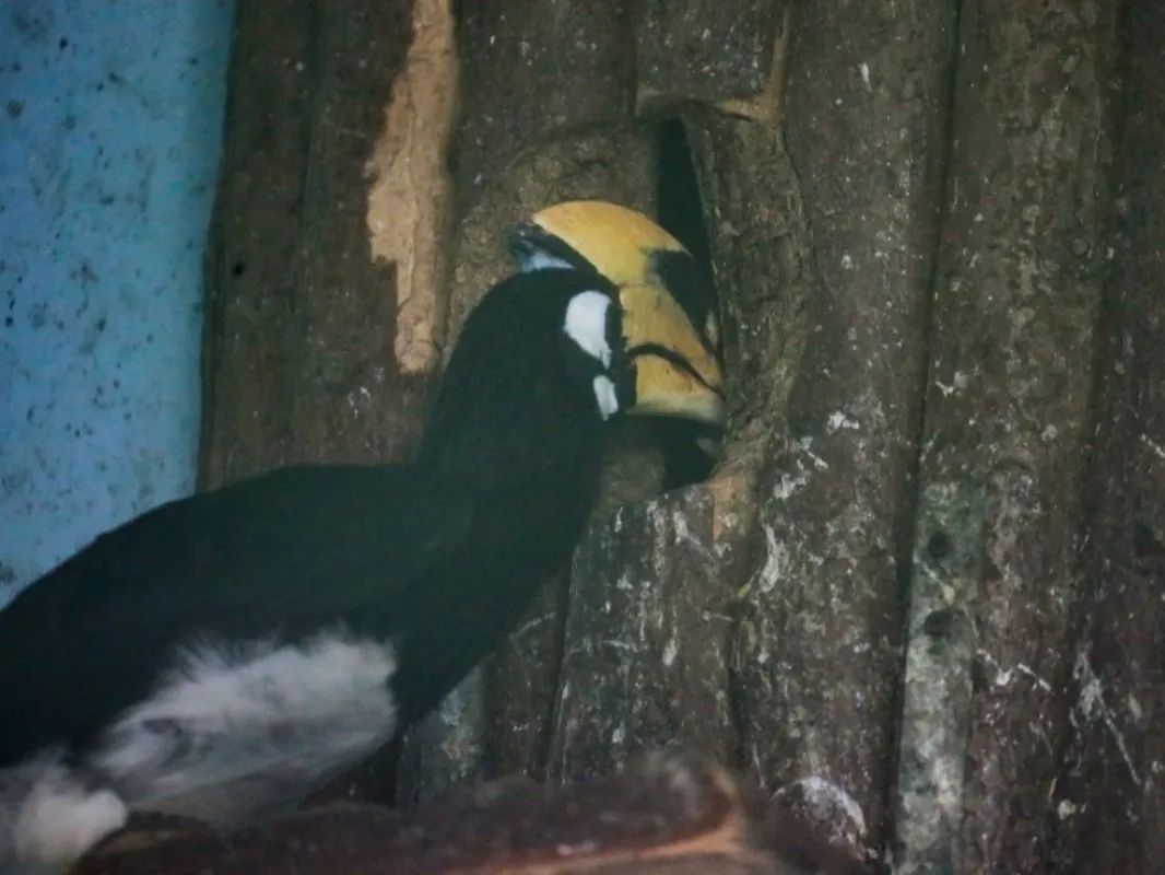 完成封巢后的冠斑犀鸟爱巢封闭的洞为雌鸟提供了安全的环境,让雌鸟能安心产卵、孵化。这种特殊的繁殖行为,有利于保护后代免受干扰和潜在危害。
