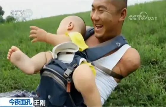 “无臂爸爸”叫王刚,辽宁省铁岭市昌图县人,13岁时王刚和几个玩伴相约外出玩耍,意外遭遇电击截去双臂。无法接受现实的他一度产生过轻生的念头,在父母的尽心陪伴下,他重拾了对生活的信心。