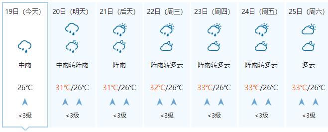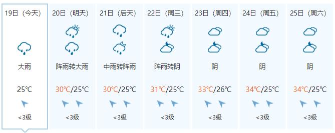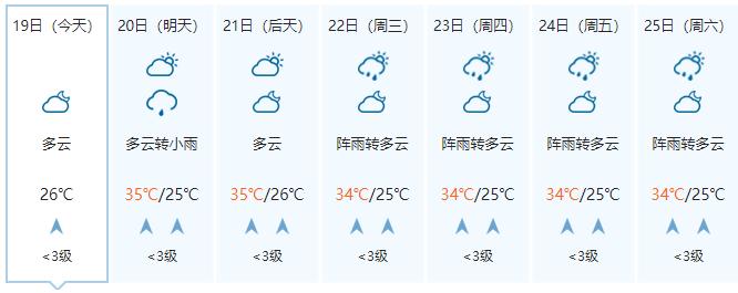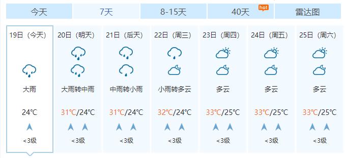 南宁市:今天晚上多云,明天白天多云午后有阵雨或雷雨,局地大雨或暴雨,偏南风2级,最低气温26℃,最高气温33℃。