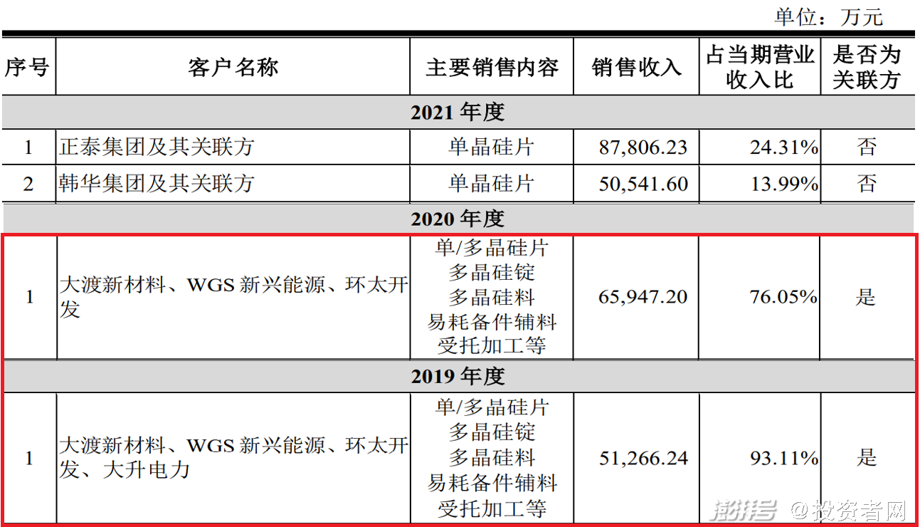 到了2021年,大渡新材料、WGS新兴能源、环太开发3家关联方公司已不在前五大客户之列,第一大、第二大客户为正泰集团和韩国韩华集团,对这两家的销售增长迅速,由2020年的8100万元和1700万元,分别增长至5.05亿元和8.78亿元。