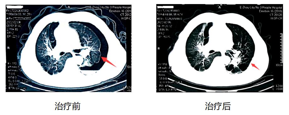 术后,复查胸部CT,提示原“左侧气胸”复查左肺中外带期内缘见肺压缩达10%,与前片比较,左侧肺气胸明显减少。影像前后对比图如下: