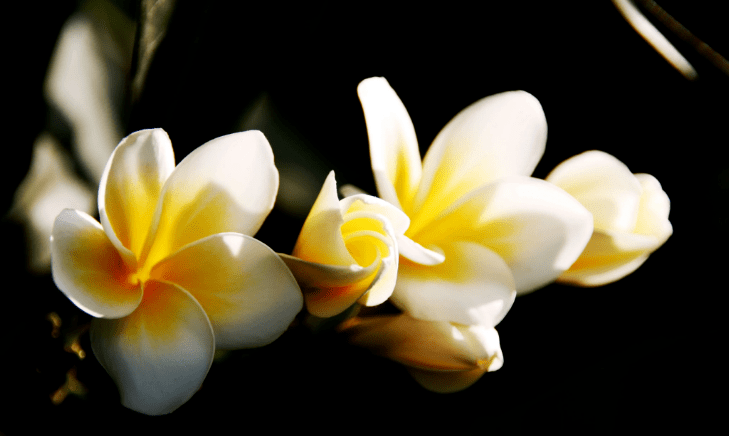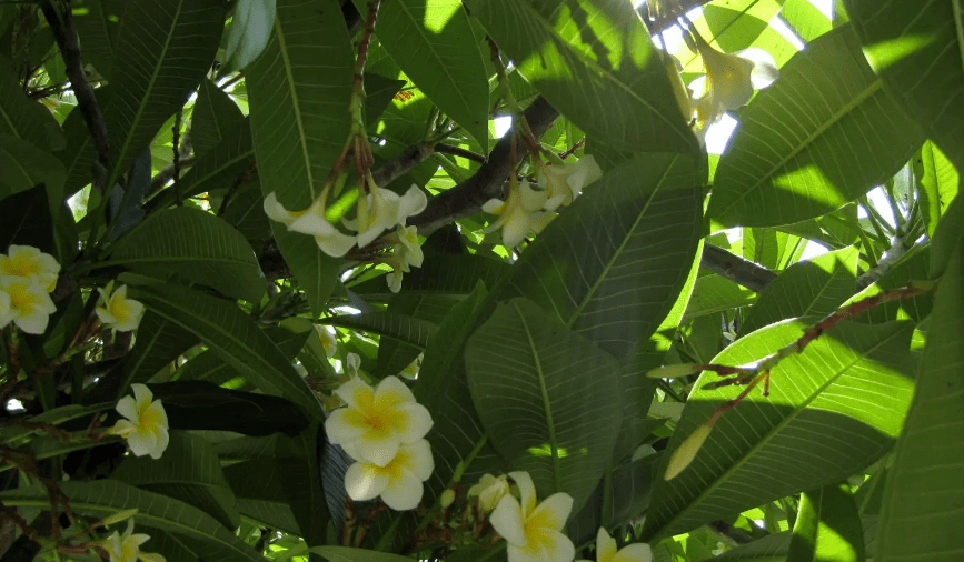 到了一家民宿,走进院子里,看见院子里到处都是鸡蛋花,不光有黄白色的,还有淡红色的、鲜红色的、暗红色的……虽然后面几种颜色的花非常稀有,但它们不再神似鸡蛋了,只是沾了前一种的光,都叫鸡蛋花。只见小径旁、泳池里都掉落着鸡蛋花,忍不住捡起来闻一闻,有一种淡淡的馨香,赶紧装进口袋里藏好。走进房间里一看,洁白的床单上摆放着几朵鸡蛋花,再摸摸口袋里藏好的鸡蛋花,不禁哑然失笑了。