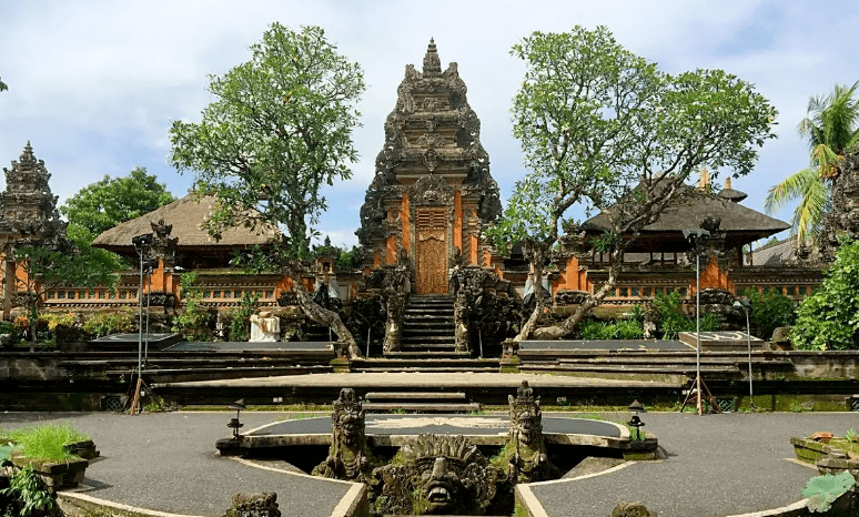 吃完早饭,大家到乌布小镇里去逛一逛。沿着马路向市中心走去,看见大路两边有不少的寺庙,寺庙的院墙内外无疑都有鸡蛋花树。许多寺庙里都供奉着石雕的神像,听说巴厘岛是整个印尼唯一信奉印度教的地方,80%的岛民都是教徒。一路走来,看见许多富裕人家的院子里都另辟一隅修建了家庙,像寺庙一样矗立着神像。连普通人家的门口都供奉着神龛,地上摆着用叶子做的方形浅盒子,里面分门别类地摆放着献给神灵的贡品——饼干点心,包着的米饭,烟类,当然还有鸡蛋花。看着这么多的供奉,我们不禁询问:是不是刚好遇到了什么节日?原来什么节也不是,人们只是把拜拜神灵当成每天的习惯。