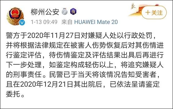 柳州警方对巫某做出的处罚决定引发很大舆论争议,大众普遍质疑警方处罚和受害者损失不对等,但伤情鉴定需要时间,所以此案逐渐淡出大家视野。