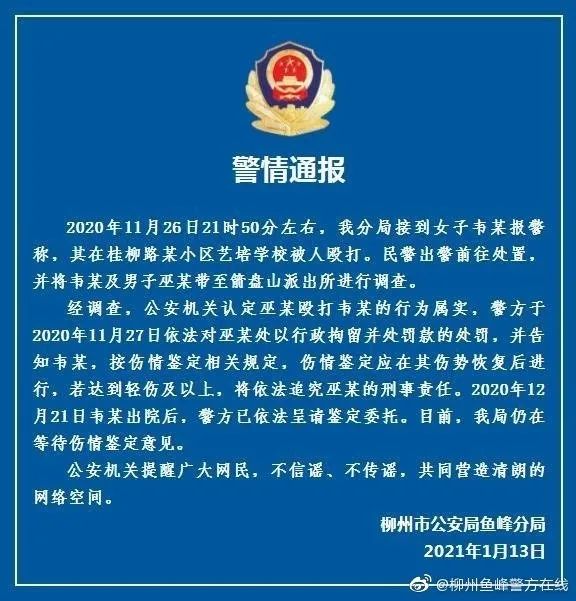 2021年1月13日,@柳州公安通 报称,“经调查,公安机关认定巫某殴打韦某的行为属实,警方于2020年11月27日依法对巫某处以行政拘留并处罚款,并告知韦某,按伤情鉴定相关规定,伤情鉴定应在其伤势恢复后进行。”根据判决书,观察者网得知巫某被处以行政拘留7日,罚款200元。