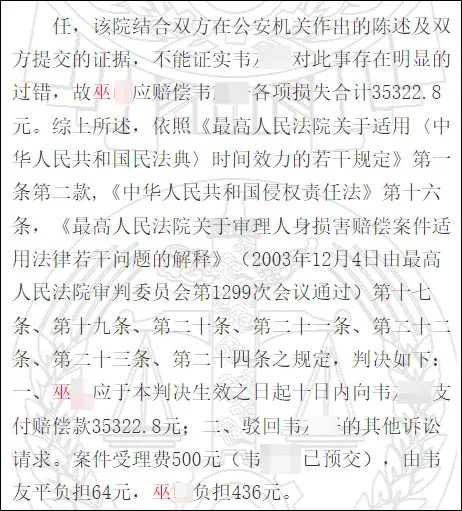 该院结合双方在公安机关作出的陈述及双方提交的证据,不能证实韦某某对此事存在明显的过错,故巫某应赔偿韦某某各项损失合计35322.8元。法院最终判决如下:一、巫某应于本判决生效之日起十日内向韦某某支付赔偿款35322.8元;二、驳回韦某某的其他诉讼请求。案件受理费500元(韦某某已预交),由韦某某负担64元,巫某负担436元。