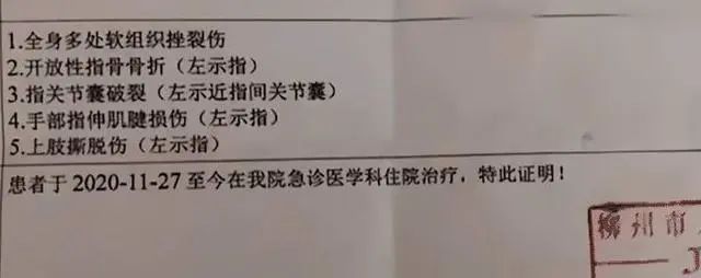 11月27日,市人民医院开具的疾病证明书显示,韦某某全身多处软组织挫裂伤、开放性指骨骨折(左示指)、指关节囊破裂(左示近指间关节囊)、手部指伸肌腱损伤(左示指)、上肢撕脱伤(左示指)。来源|观察者网 文/王濛