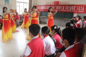 “今天,就让我们一起来欣赏舞蹈《春暖花开》。”随着音乐声响起,江西现代职业技术学院商务学院“红色追梦”暑期三下乡实践队的3名大学生志愿者在教室里翩翩起舞,一曲结束,一曲再起,实践队为鸣山小学的孩子们表演了一个又一个精彩的文艺节目,丰富孩子们的课余生活。鸣山小学的孩子也积极响应志愿者,现场表演了舞蹈《最美的花季》,向嘉宾和志愿者们展示了纯真的童年时光。