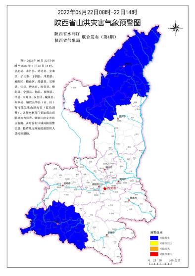 预计2022年06月22日08时至2022年6月22日14时,吴起县、志丹县、靖边县、安塞区、子长市、子洲县、米脂县、榆阳区、横山区、绥德县、吴堡县、佳县、神木市、府谷县、略阳县、宁强县、勉县、留坝县、洋县、南郑区、汉台区、城固县、西乡县、镇巴县等县(市、区)有可能发生山洪灾害(蓝色预警)。各级水利部门要加强山洪隐患巡查排查、做好山洪灾害站点监测,及时发布区域风险预警信息,提请地方政府提前组织人员转移避险。