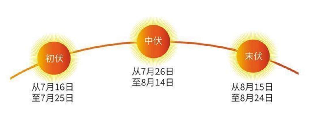 今年的夏至是公历6月21日,从夏至日算起,第一个“庚日(庚戌日)”是6月26日;第二个“庚日(庚申日)”是7月6日;第三个“庚日(庚午日)”是7月16日,于是7月16日就成了今年初伏(也叫头伏)的起始日。初伏持续的时间固定为10天,所以,今年的初伏就是从7月16日至7月25日;末伏(也叫三伏),是立秋之后第一个“庚日”。今年立秋是8月7日,往后找到的第一个“庚日(庚子日)”是8月15日,这一天就是末伏的第一天。末伏持续的时间也固定为10天,所以,今年的末伏就是从8月15日至8月24日。初伏和末伏之间的时间,都是中伏,有的年份是10天,有的年份是20天。今年的中伏是20天,从7月26日至8月14日。