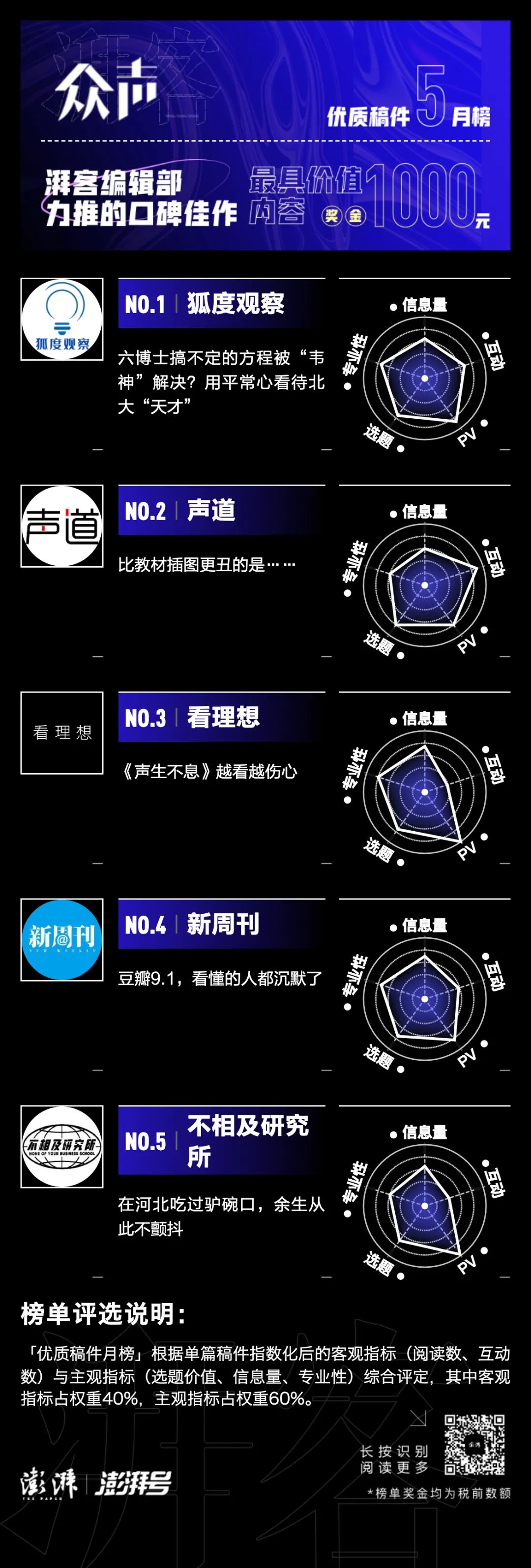 “优质稿件月榜”致力于激励湃客平台上每月最具价值的优质原创内容,除考察稿件的点击量、互动数等客观指标外,编辑部还将对稿件的选题价值、专业性、信息量等维度进行打分,计算综合得分,按照品类进行排名,每个参评品类各评出5篇稿件。上榜作者均可获得来自澎湃新闻的专属流量扶持、专业点评、海报露出及税前1000元的奖励金等权益。