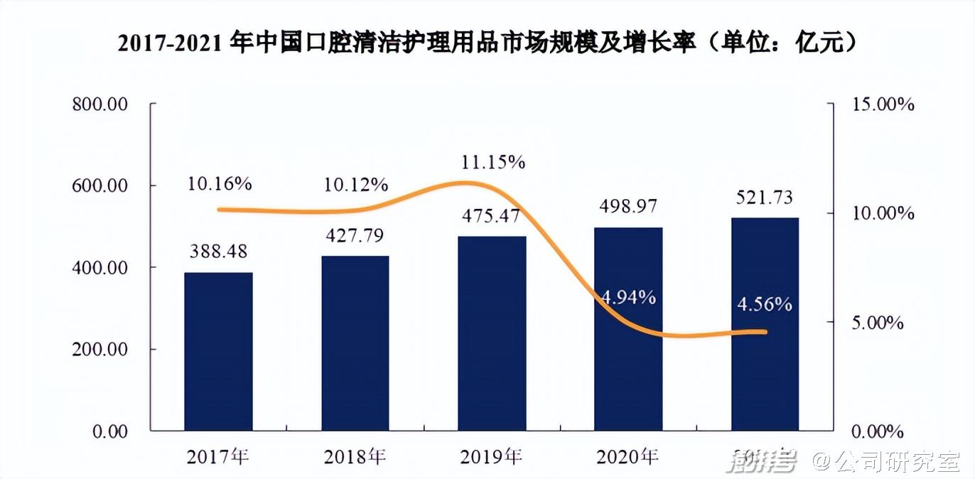 2017年到2021年,我国口腔清洁护理用品行业市场规模从388亿增长至522亿,年复合增长率7.65%,但2020年和2021年,行业增速分别只有4.94%和4.56%。