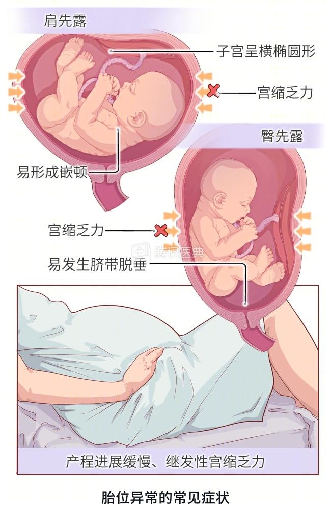 又比如,正常情况下胎儿通常是头部最先出来。如果胎先露异常(如臀先露、肩先露)、胎位异常,都可能使阴道分娩变得困难,增加胎儿受伤甚至死亡的风险,母亲也容易发生产伤,因此这些情况下首选剖宫产。
