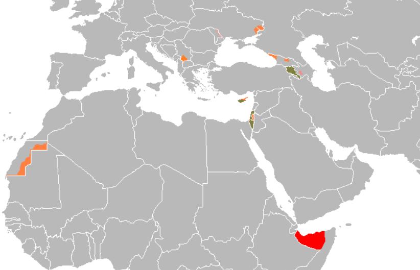▲有限承认政权(绿色为联合国会员国、橙色为至少有一个联合国会员国承认该政权、红色为未被任一联合国会员国承认)