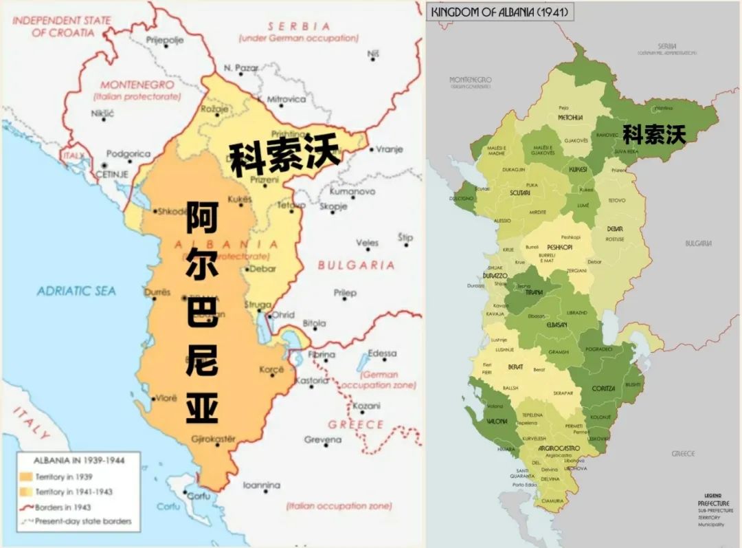 ▲意占时期阿尔巴尼亚的领土扩大(米黄色)与行政区划(右图)