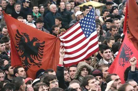 ▲手举阿尔巴尼亚和美国国旗的科索沃民众