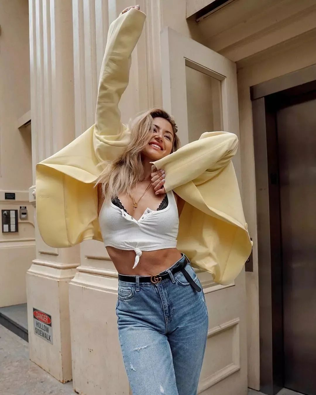 在腰间骤然收紧,露出盈盈一握的小腰,配上宽大不羁的牛仔裤,这强烈的反差感,谁不心动呢?解锁穿搭