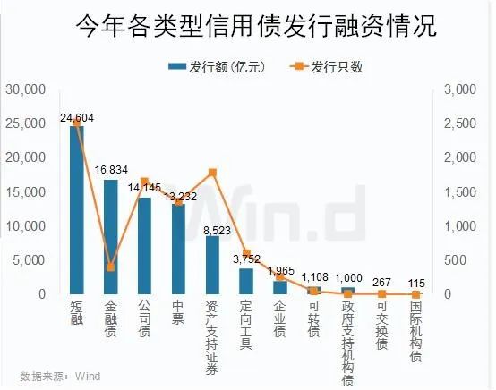 具体来看,今年发行规模最大为短融,合计发行了2521只,融资24603.86亿。紧随其后金融债、公司债和中票发行规模都在万亿之上,这些债券融资是市场主力。而融资最小的则是国际机构债和可交换债,均不足300亿,数量也不多。可见各类型债券发行差异较大。