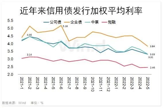 同样企业债去年上半年基本在4.5%以上,个别月份一度突破5%,而今年上半年基本在4.5%以下徘徊,5月份更是大幅下降至3.84%。