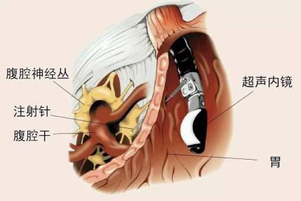我院采用的纵轴式超声内镜止痛疗法:是在超声内镜的引导下,用一根细小的穿刺针,将无水酒精注入相应的腹腔神经丛,阻断腹腔脏器的痛觉神经,从而起到止痛效果。