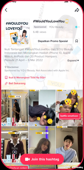 前段时间,印尼消费者在TikTok上被#WouldYouLoveYou 挑战赛刷屏,视频的互动次数超过30多万次。