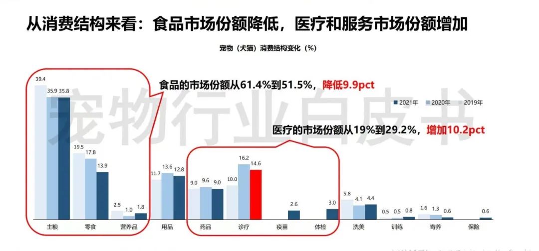 从消费结构来看,从2019年到2021年,宠物食品的市场份额从61.4%降低到51.5%,下降接近10个百分点;宠物医疗的市场份额从19%到29.2%,增加了10个百分点;宠物训练的市场份额3年间从0.5%升至0.8%,占比依然很小。