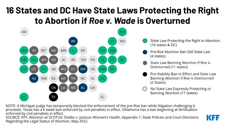 此判例对全美的女性和家庭权利、商业与经济、立法与司法,政治和选举走向等都会产生深远的影响。据预测,在最高院推翻Roe v. Wade之后,将会有近一半的州会事实上禁止所有或几乎所有的堕胎权利。(如图)
