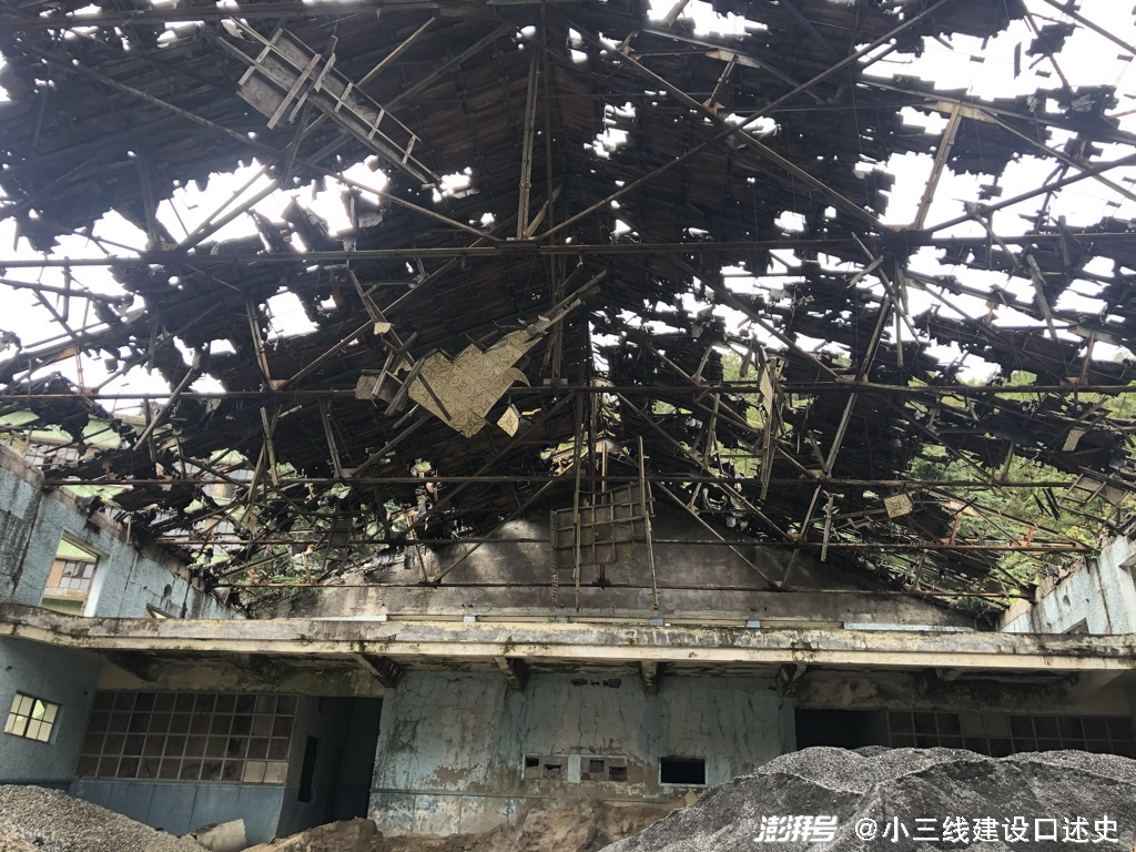 最壮观的是当时的大礼堂。协作厂在上世纪70年代后期开始兴建。大礼堂在当时主要承担电影院的功能,在交通不便的后方发挥着重要的精神娱乐作用,也是员工们回忆小三线生活津津乐道的对象。而现在大礼堂已经大半坍圮,只残留着小半屋顶,屋顶上的木板已凋零地七零八落,光线顺着这些缺口打在废墟上。从残存的遗迹,仍可想见当时大礼堂规模之宏大,甚至是当时人声鼎沸的热闹景象。正是这一个场景让我受到了极大的触动,不再只是简单地为了完成一个课程任务而调研,而是真的想去了解彼时彼地这一群人的历程——一群人离开城市,来到交通闭塞、条件艰苦的农村,建设了十多年的历程。作为历史学系的学生,我们有责任去了解这段历史,去为他们留下一段记录。