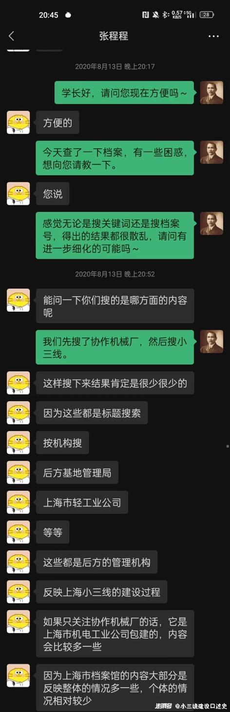对于档案的查询,还有很多疑问,我带着查档的疑问向徐有威老师的高足张程程学长请教,张程程学长对于小三线也进行了不少资料收集、研究的工作,之前在档案馆预约上就给予我们很多帮助,对于我们新的问题,更是热心回答。档案的利用,的确不易,想要应用资料,除了能少量复印以外,其他的都要自己手打,没有大量的时间和充足的精力,充分利用好档案,谈何容易。