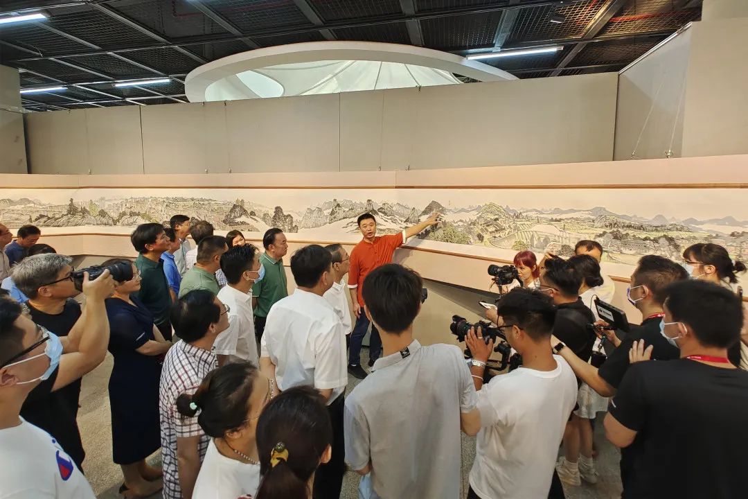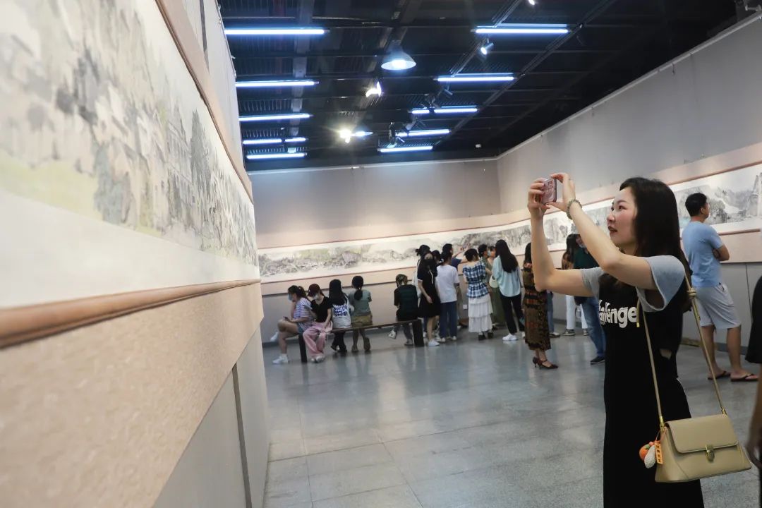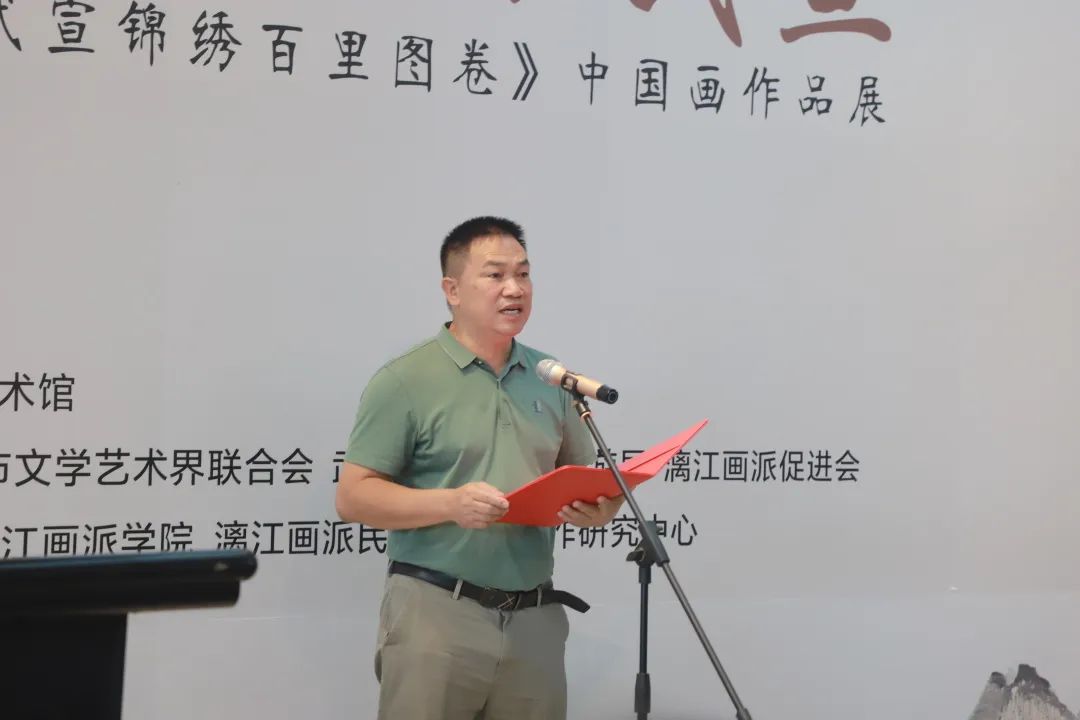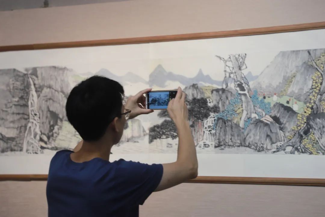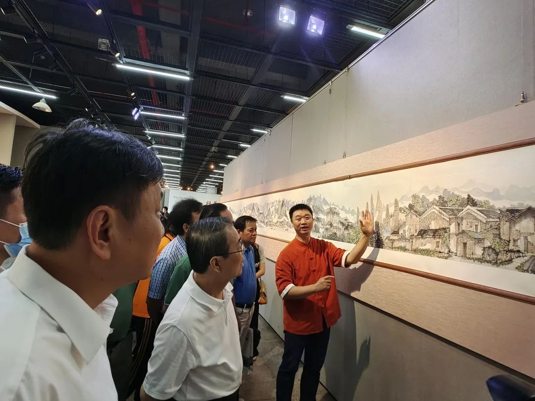 武宣县政协主席吴海音参加开幕式,并致辞。画展现场,一幅由广西艺术学院中国画学院院长钟涛教授历时四年半、采风写生画出的195米巨幅画卷——《大美武宣锦绣百里图卷》成为了全场的焦点,吸引了众多书画爱好者,不少参展者驻足观赏,时不时举起手机拍照留念。