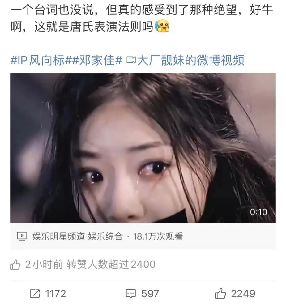 《通天塔》中饰崔善。 / 图源:微博@通天塔虽然《回廊亭》开播后不久,“回廊亭失望”就冲上了微博热搜。与常见的剧粉、演员粉互相“甩锅”不同,大家几乎都在一边倒地抨击改编和导演,并且纷纷留言这部剧配不上邓家佳的表演水平。