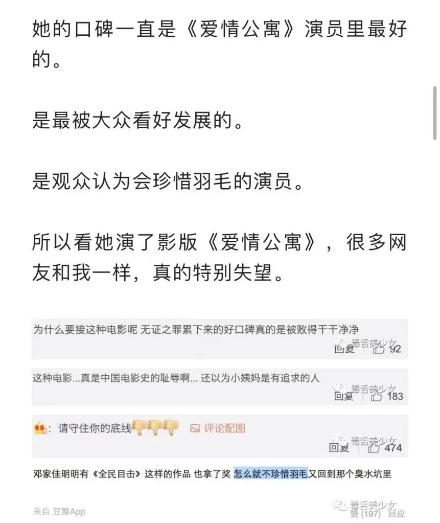在吐槽视频下面,网友的评论收获了七千多赞。这个时候我们恍然发现,邓家佳早已在不知不觉间摘掉了《爱情公寓》的标签。在多年的沉淀和积累下,她成为了观众们都认可的实力派演员。