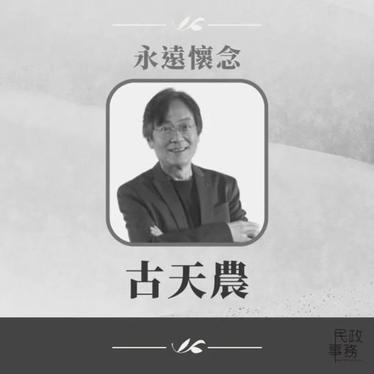 6月24日,香港民政事务局亦公开表示:“古天农一生热爱戏剧,多年来积极培育人才,致力推广香港的文化艺术发展,我们对他的离世深感难过,并会永远怀念他。”