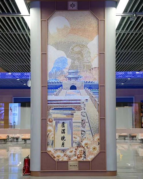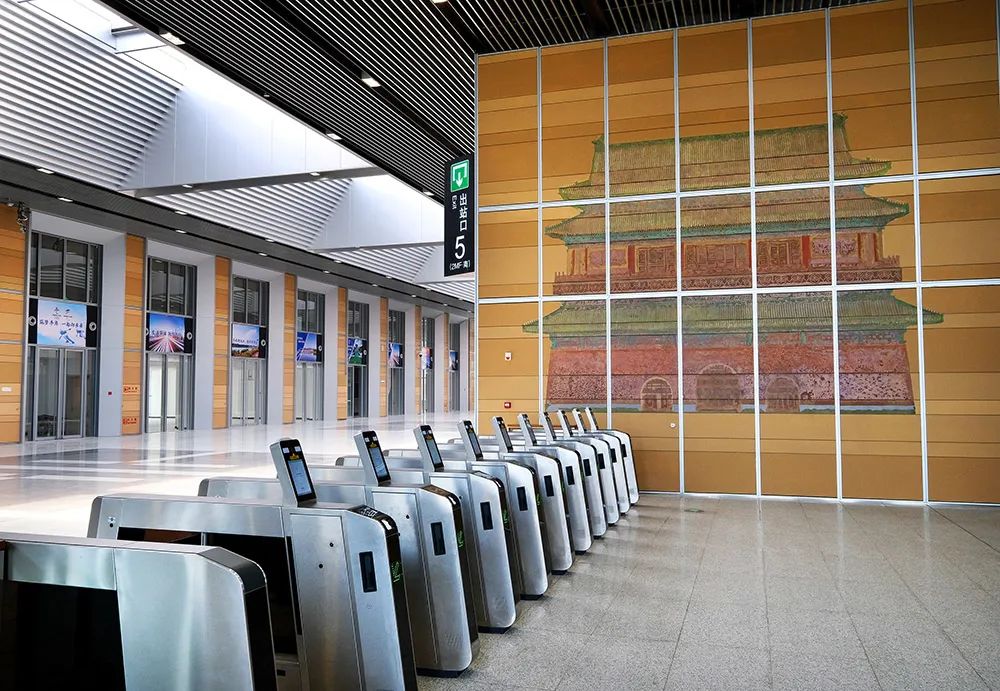 出站通道两侧墙壁布置着前门荟萃、鼓楼壁画、京味庙会等墙壁装饰