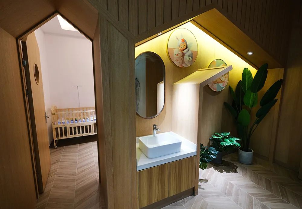 在候车大厅一处母婴室可以看到小木屋般温馨的母婴室