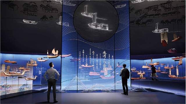 ▲ 中国大运河博物馆独创“三维版画”数字媒体语言,重塑大型古代舟楫,营造“人在画中游”的沉浸式体验。